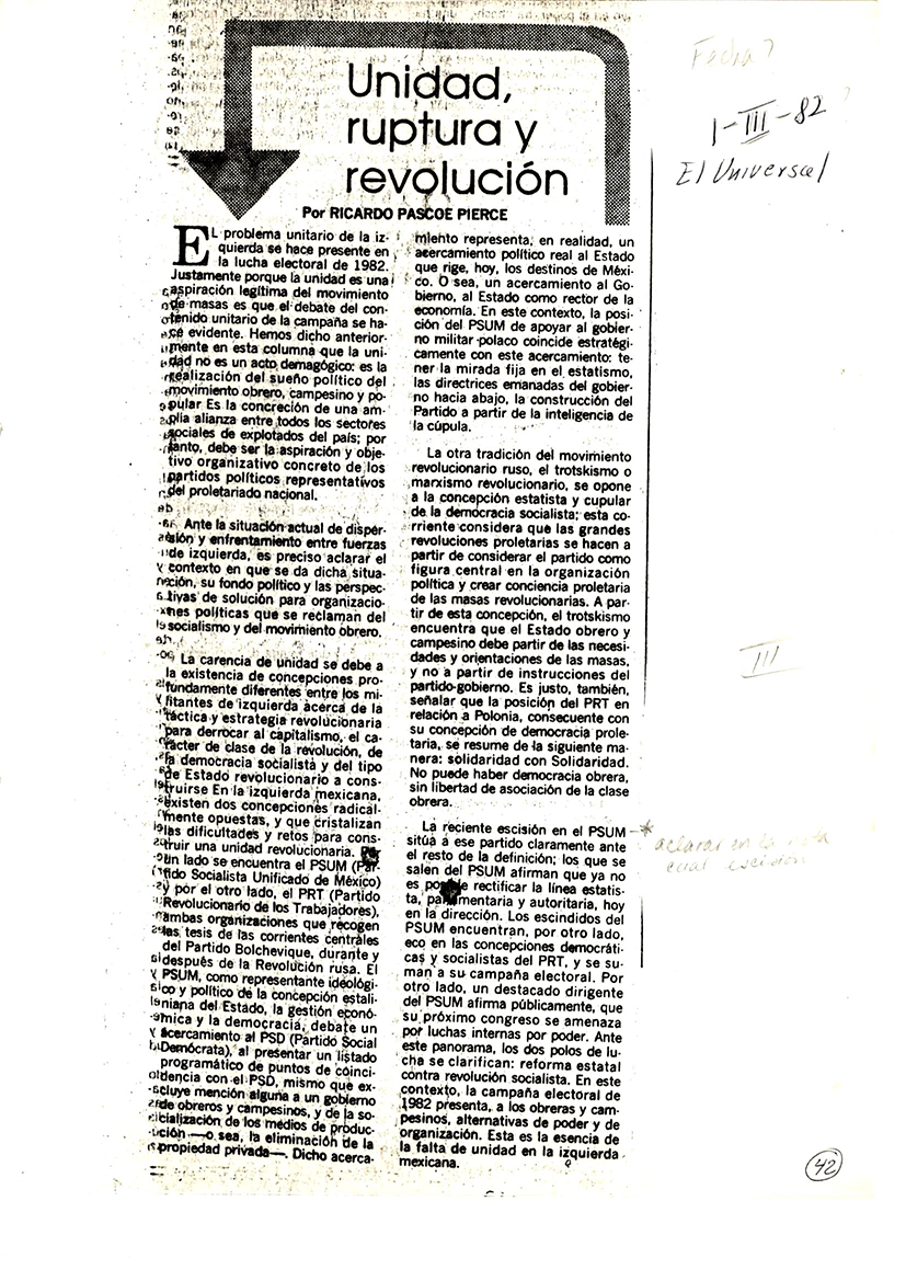 Unidad, ruptura y revolución. El Universal. 1 de marzo. 1982