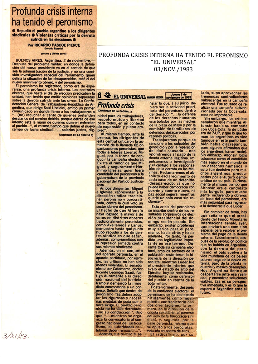 Profunda crisis interna ha tenido el peronismo. El Universal. 3 de noviembre 1983