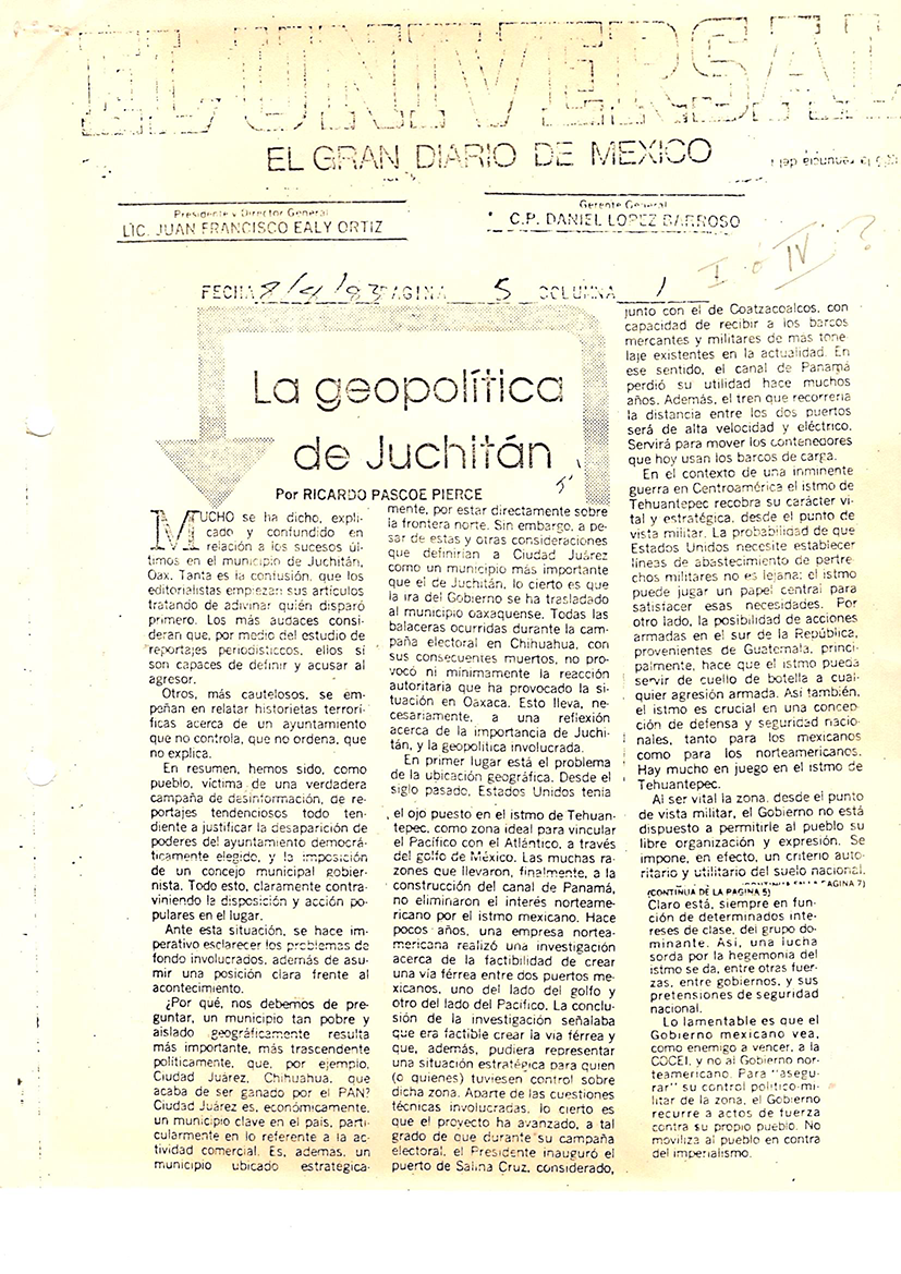 La geopolitica de Juchitán El Universal. 4 de julio 1983
