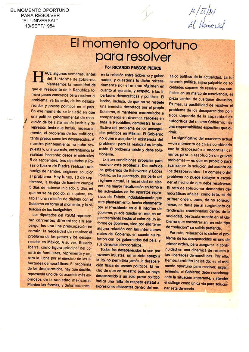 El momento oportuno para resolver. El Universal. 10 de septiembre 1984