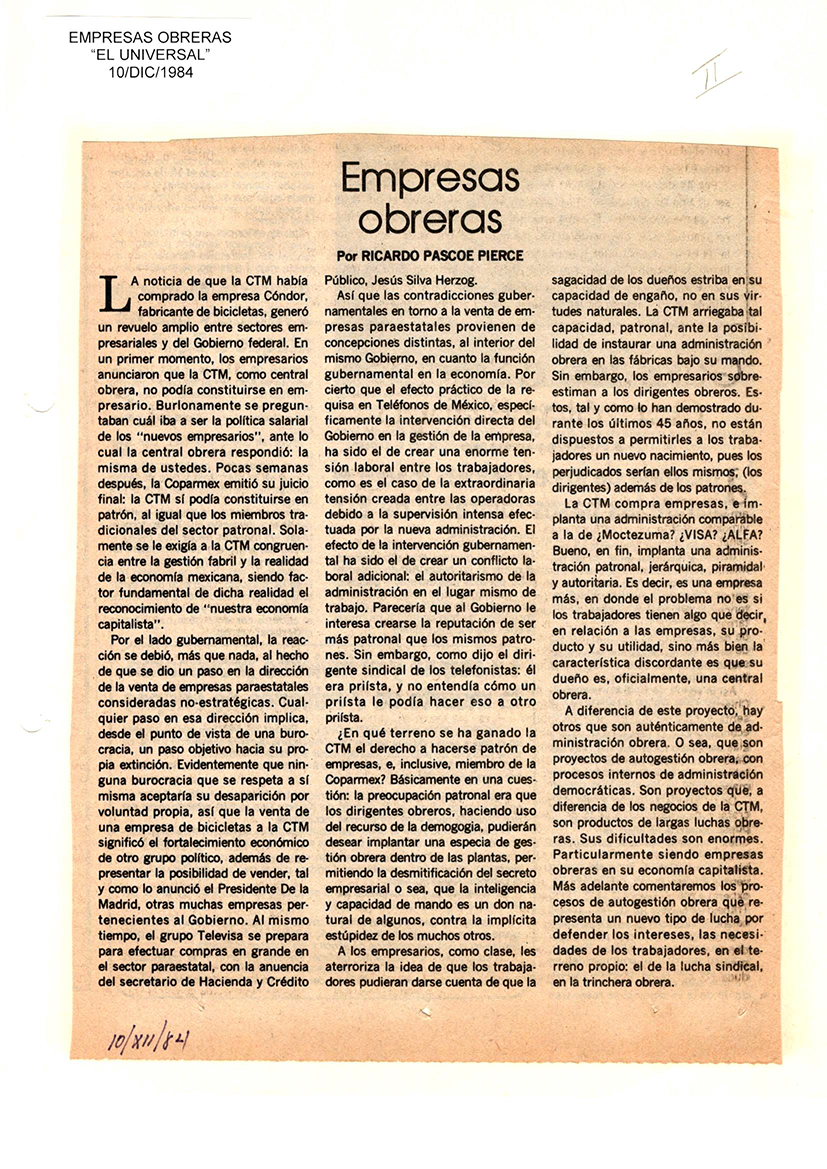 Empresas Obreras. El Universal. 10 de diciembre 1984.