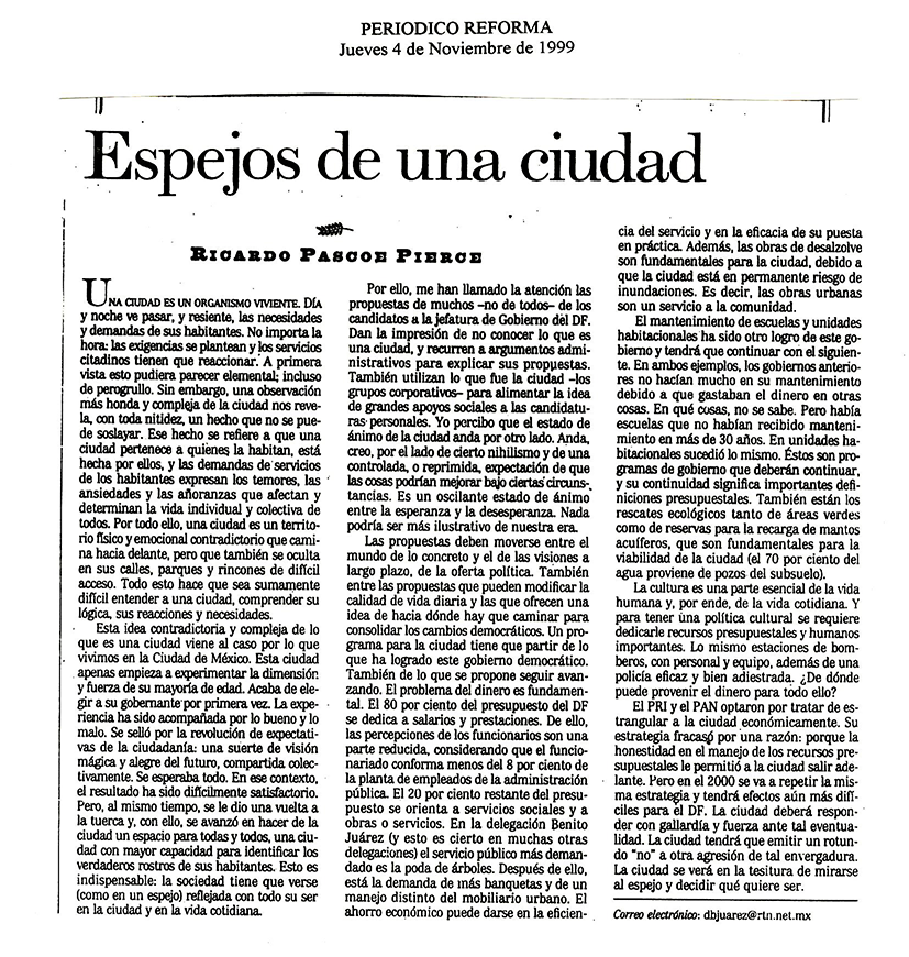 Espejos de una ciudad. REFORMA .4 de noviembre 1999