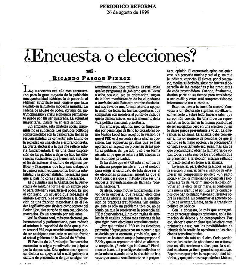 ¿Encuesta o elecciones?. REFORMA. 26 de agosto 1999