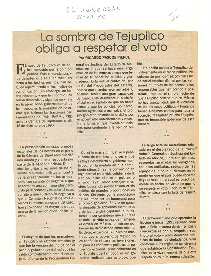 La sombra de Tejupilco obliga a respetar el voto. El Universal. 31 de diciembre 1990