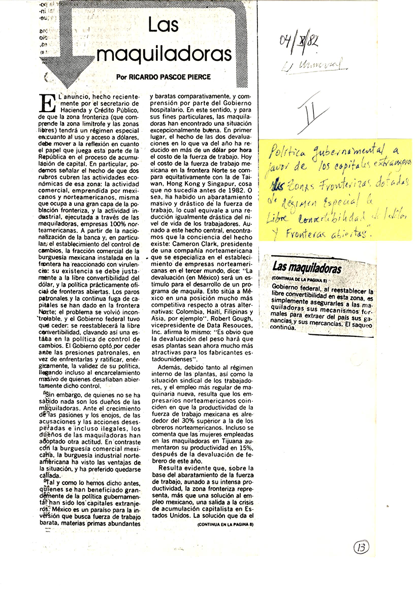 Las maquiladoras. El Universal. 4 de octubre 1982