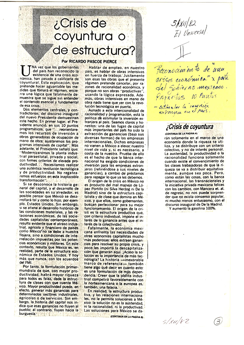 ¿Crisis de coyuntura o de estructura? El Universal. 5 de diciembre 1982