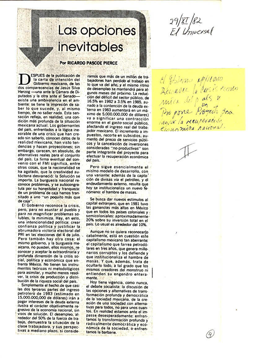 Las opciones inevitables. El Universal. 29 de Noviembre 1982
